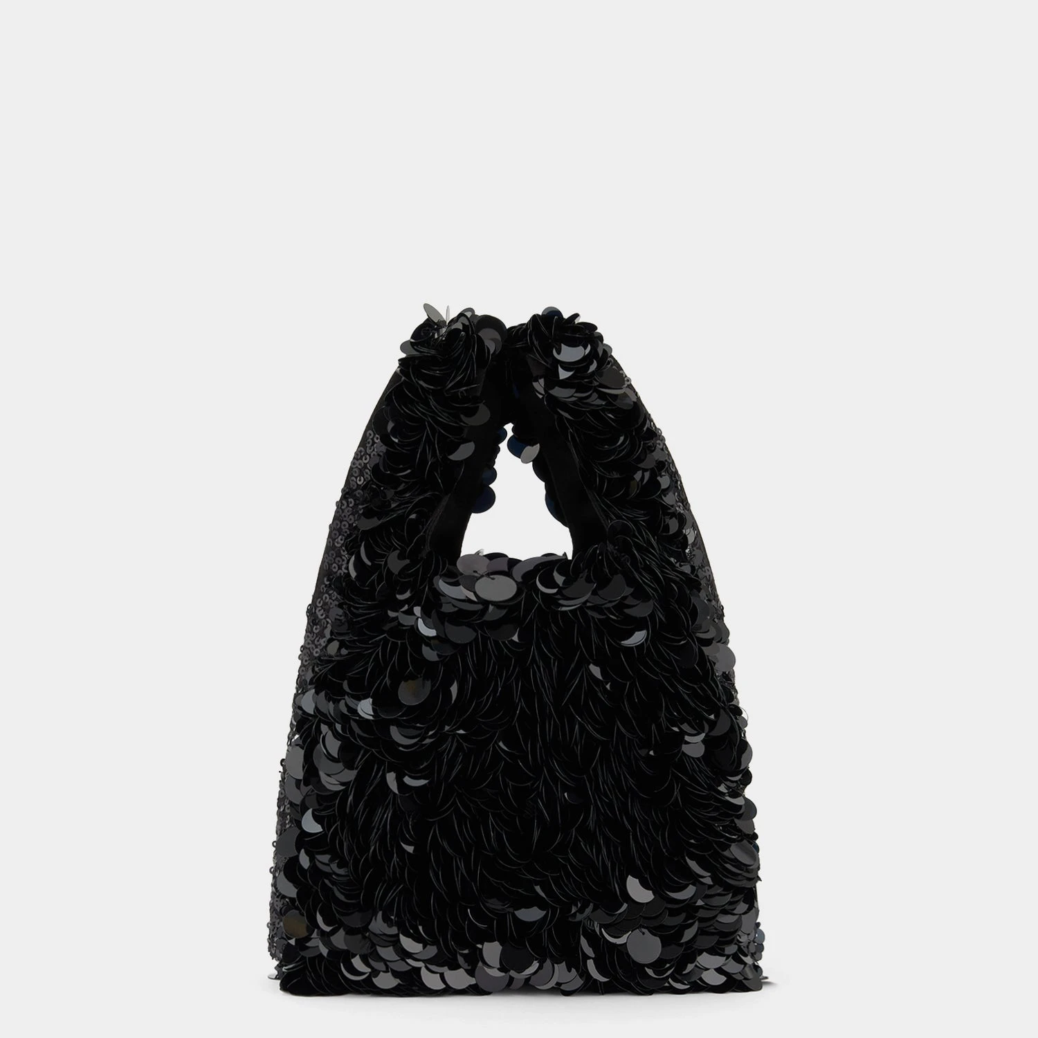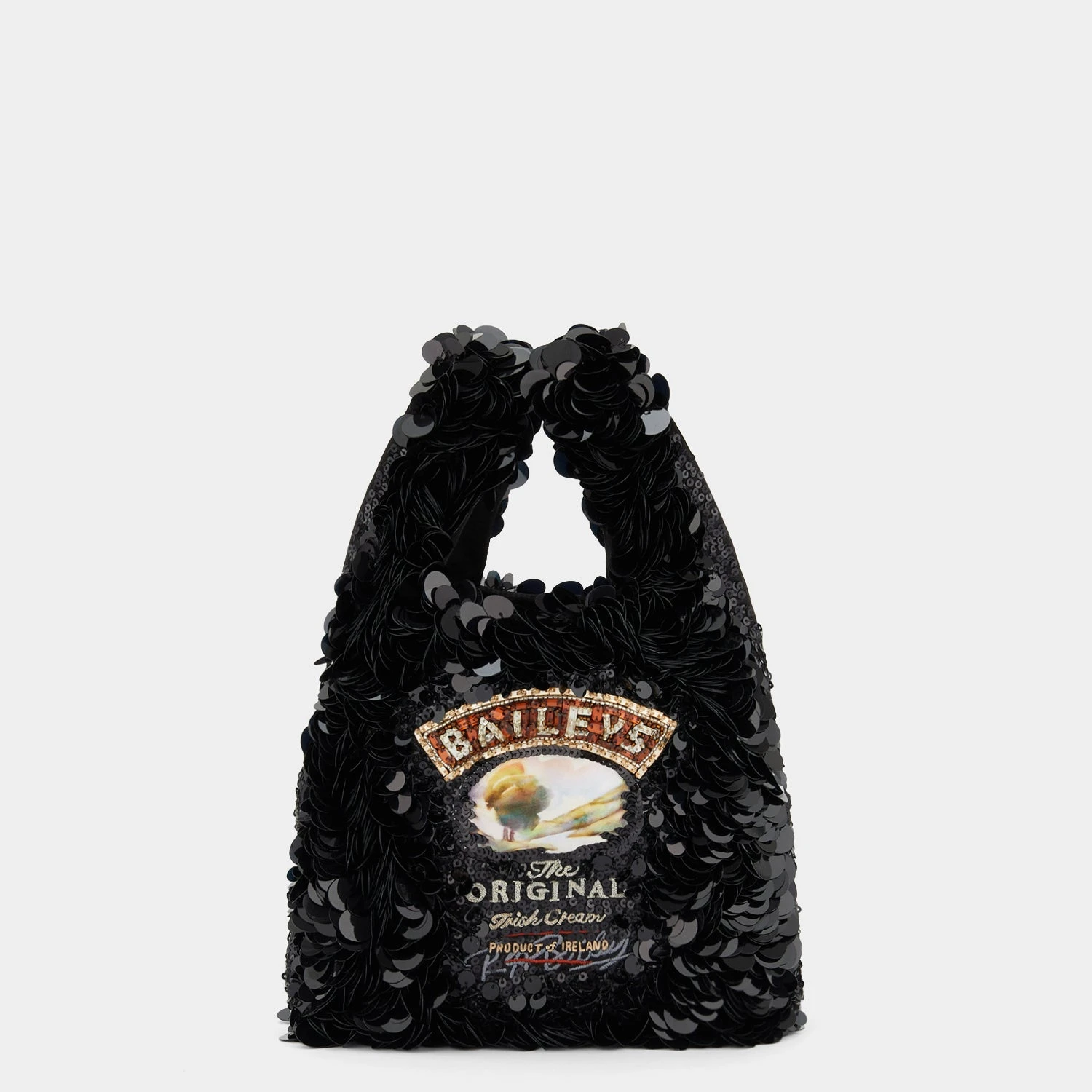 Taking inspiration from a well-curated drinks trolley or your favourite local haunt, this tote pays homage to an iconic tipple while reimagining a classic evening accessory. An instant conversation starter, it recreates Baileys’ recognisable branding in sequin embellishments on recycled satin and is topped with two simple straps to position the bag at the crook of your arm.