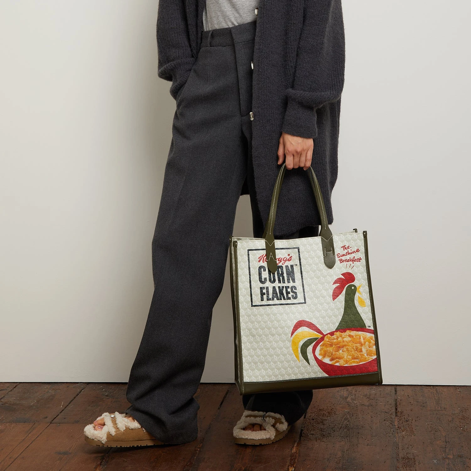 Start your day right with our Corn Flakes Shopper, a playful reimagining of a staple style. It is made from our logo-print, recycled canvas (designed with a durable coating to protect on rainy days) and splashed with a striking digital print, which pays homage to one of our favourite cereals. Meanwhile, its handles and base are rendered in sustainably produced eco leather. Throw it over your shoulder and fill it with groceries, daily essentials, or other treasures.