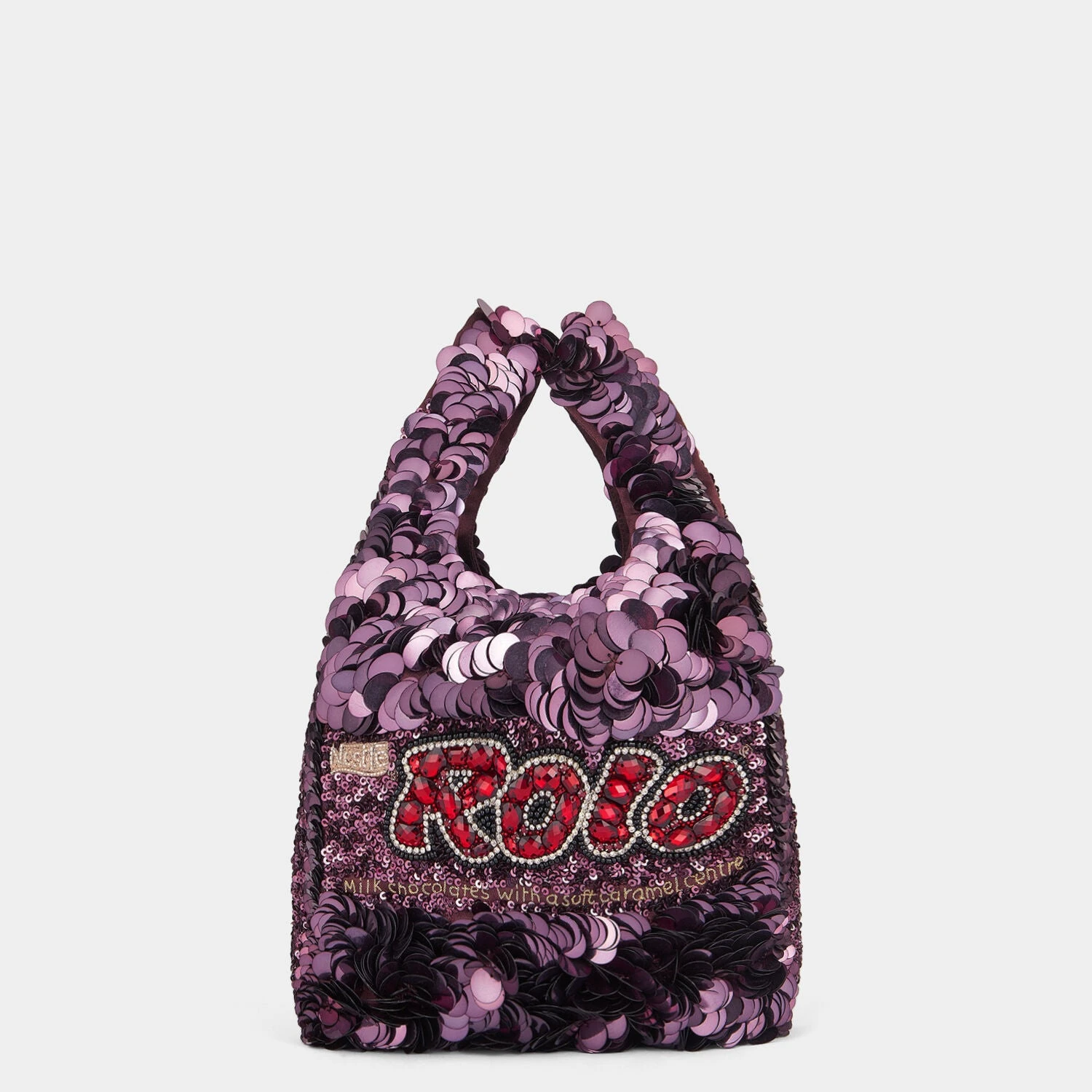 Immortalising one of our tuck shop favourites in shimmering sequins and crystals, this recycled-satin tote displays Rolo’s iconic branding over one side and is signed off with our signature bow motif embroidered on the other. Playfully practical, it’s topped with two handles that can be held in your hand or hung from your arm.