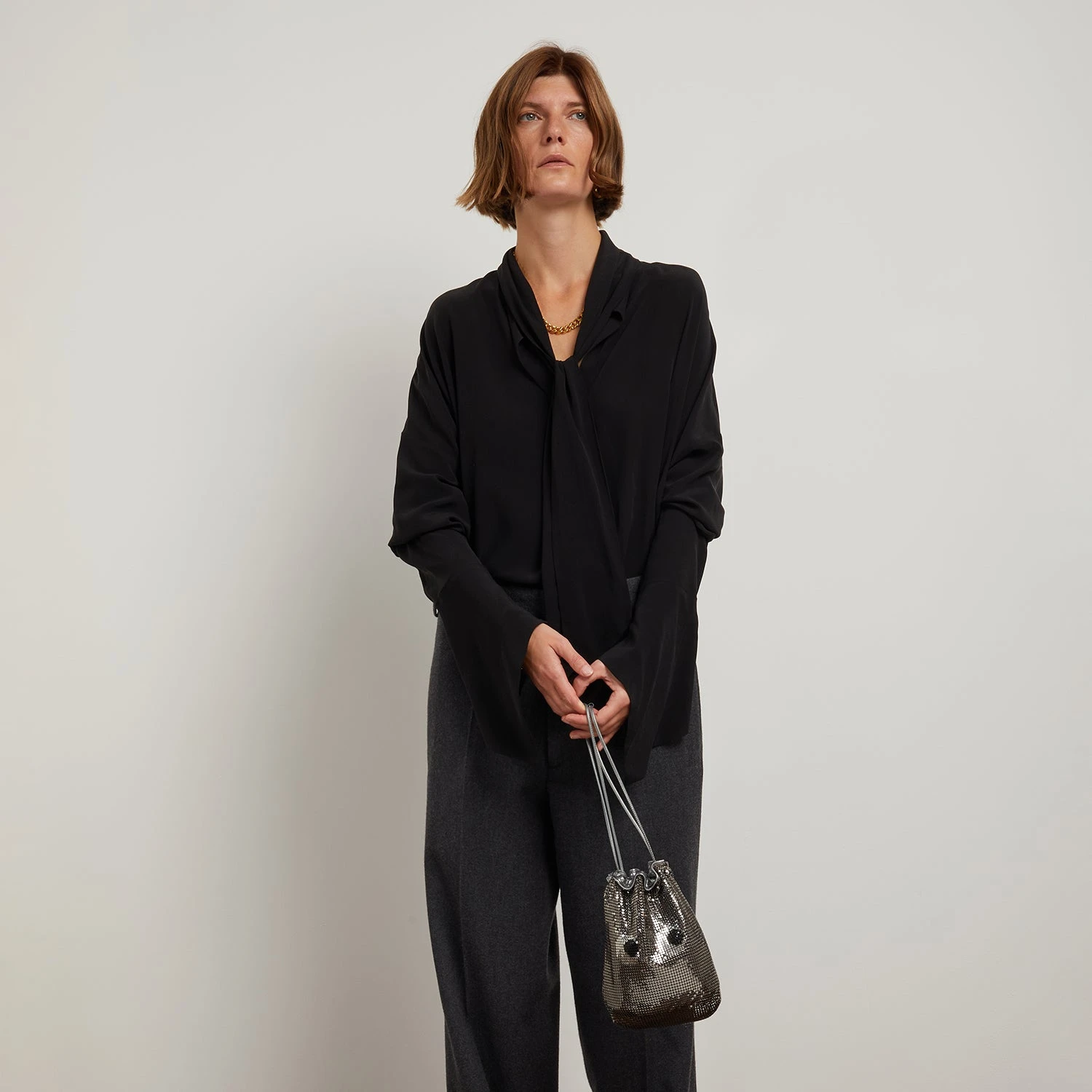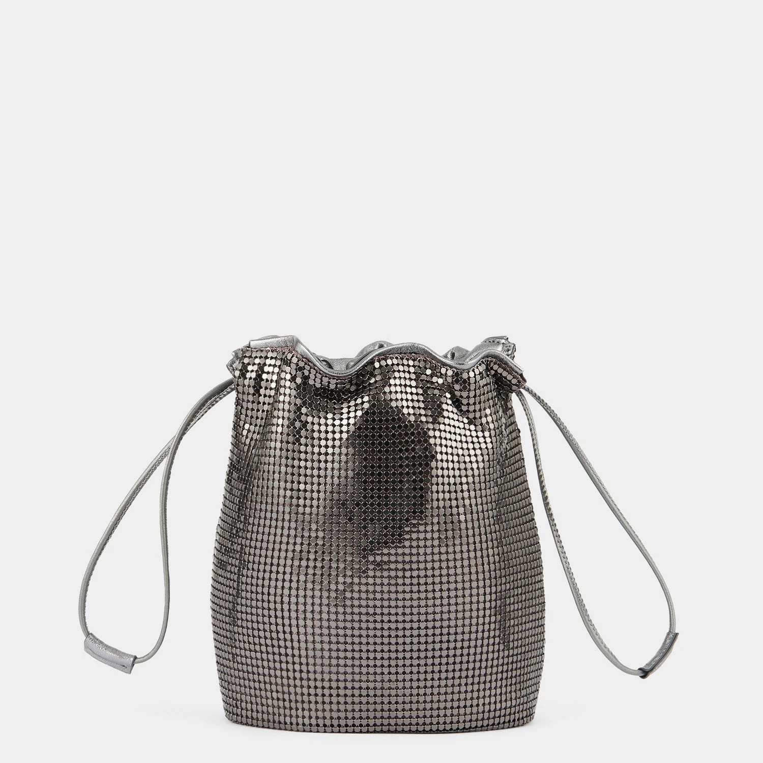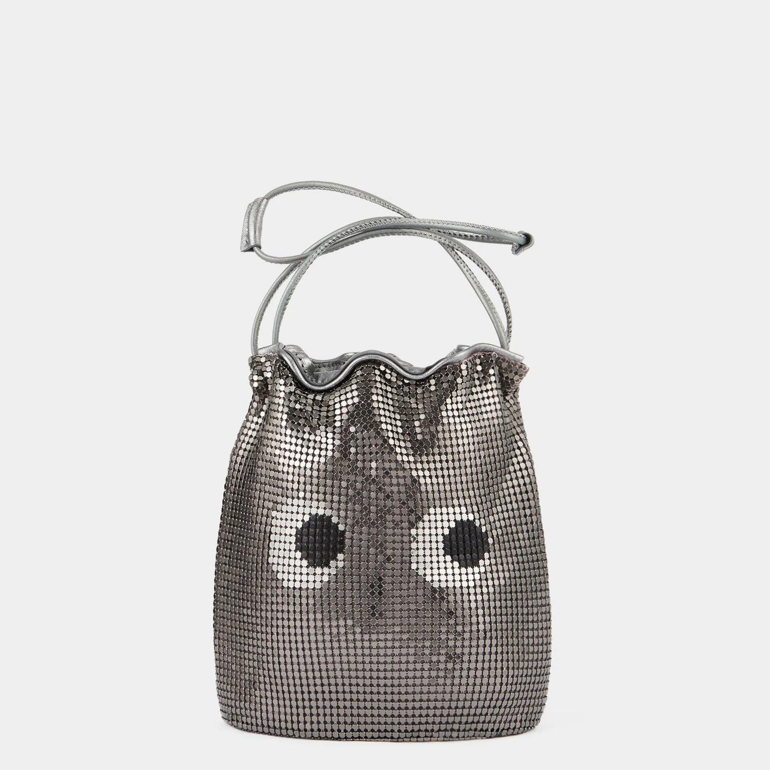 Our Eyes Mesh Drawstring Pouch will make a chic talking point at your next special event. It’s constructed from shimmering, anthracite mesh, intarsia-woven with Anya’s eyes motif, and lined with suede – with ample room for your party must-haves. Loop its metallic nappa leather drawstrings around your wrist and tote it alongside a cocktail dress; the chainmail is wonderfully soft and never, ever snags.