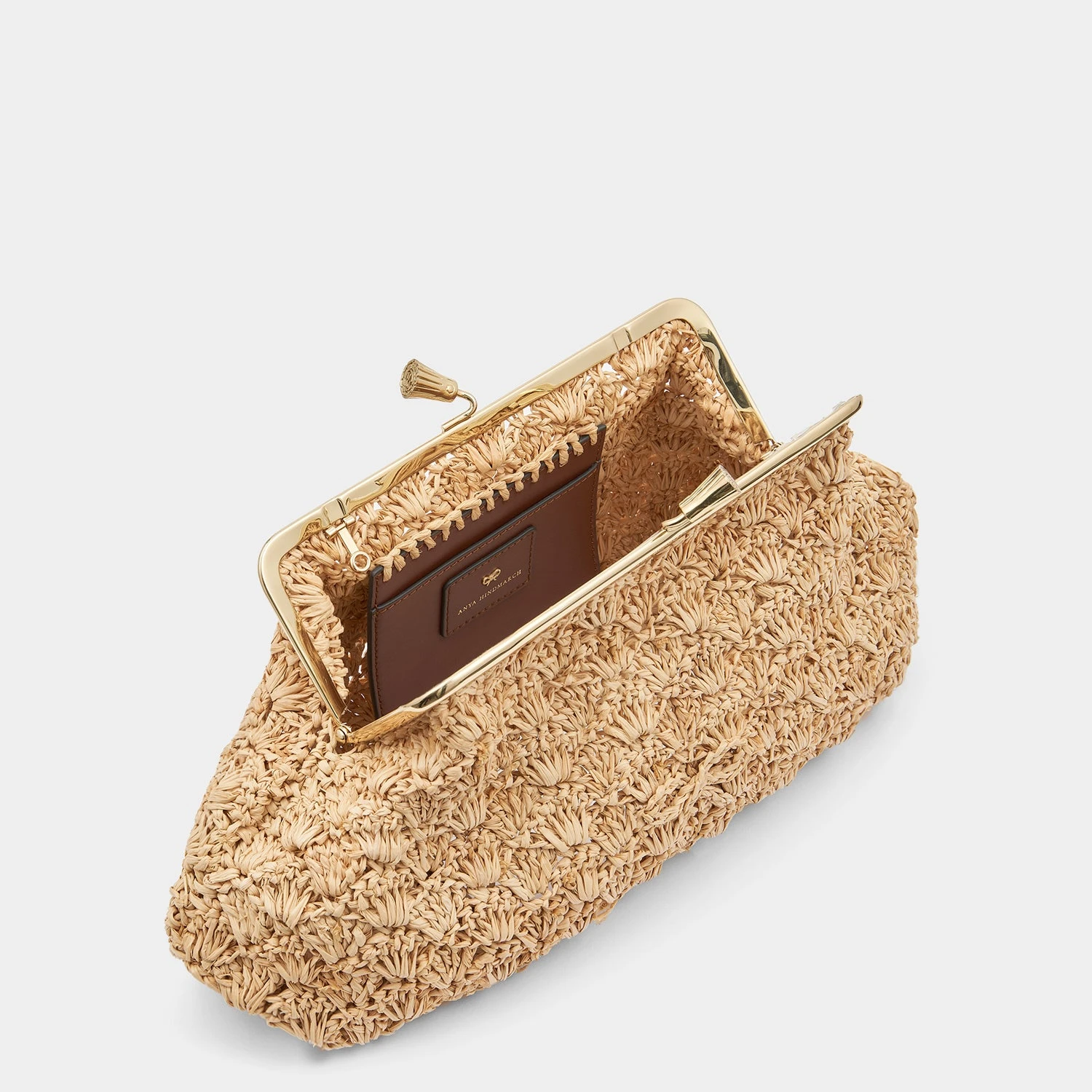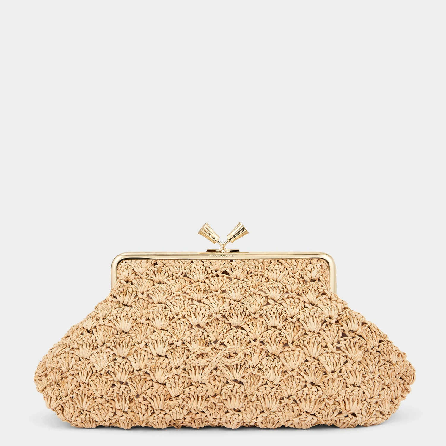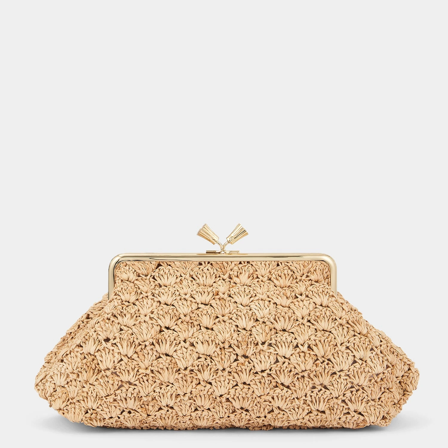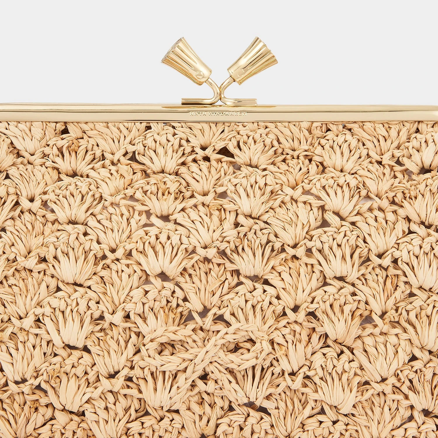 A staple in our Maud collection is granted a summer-ready makeover thanks to intricately woven raffia to create this iteration of our bow clutch. Gold-toned hardware defines the classic clasp fastening at the top as well as the detachable chain strap neatly stowed away inside that allows you to style this on one shoulder or across your body when you want to keep your hands free for a glass of champagne or a canapé. Keeping everything safely stored, the inside is home to a leather slip pocket for your travel or credit card and happily joins everything from your phone and keys to a lipstick or two for touch-ups throughout the evening.