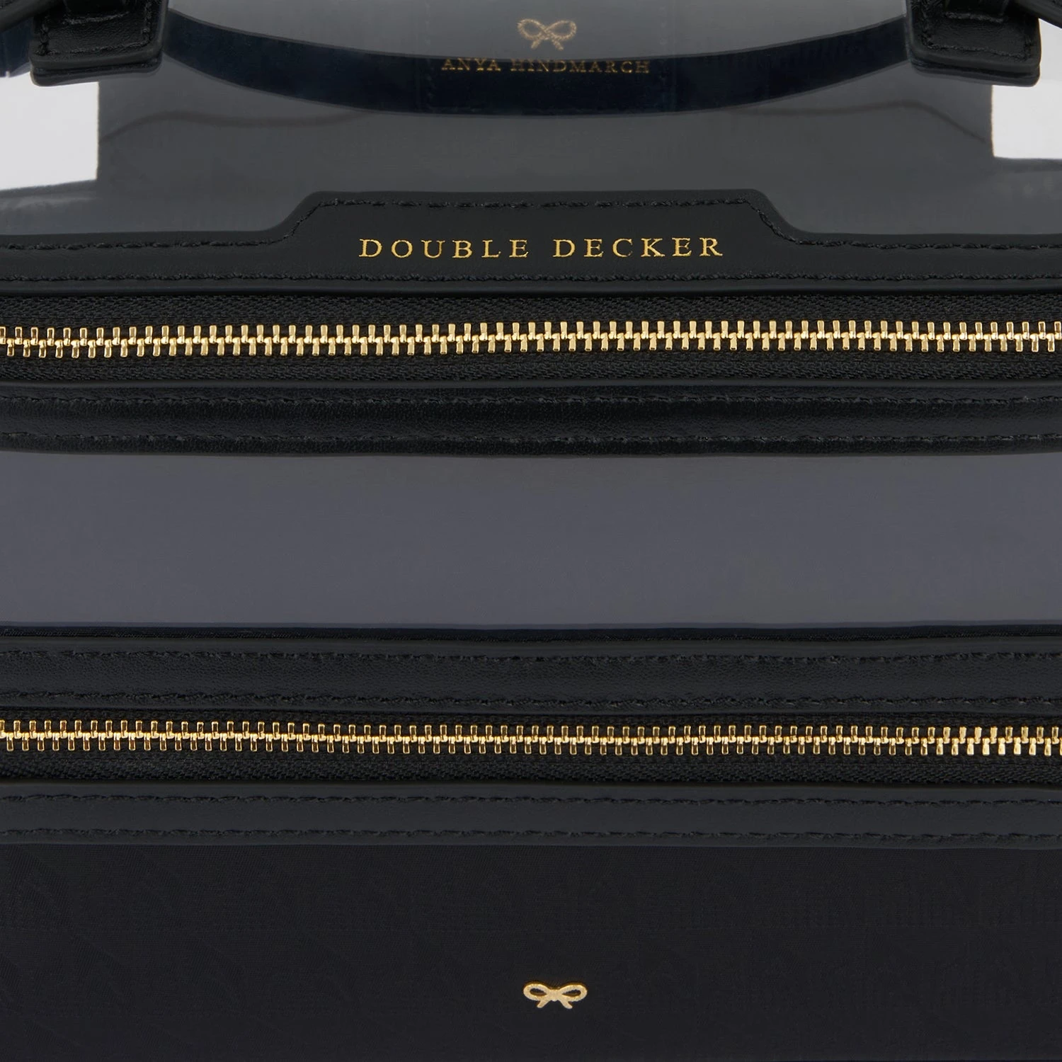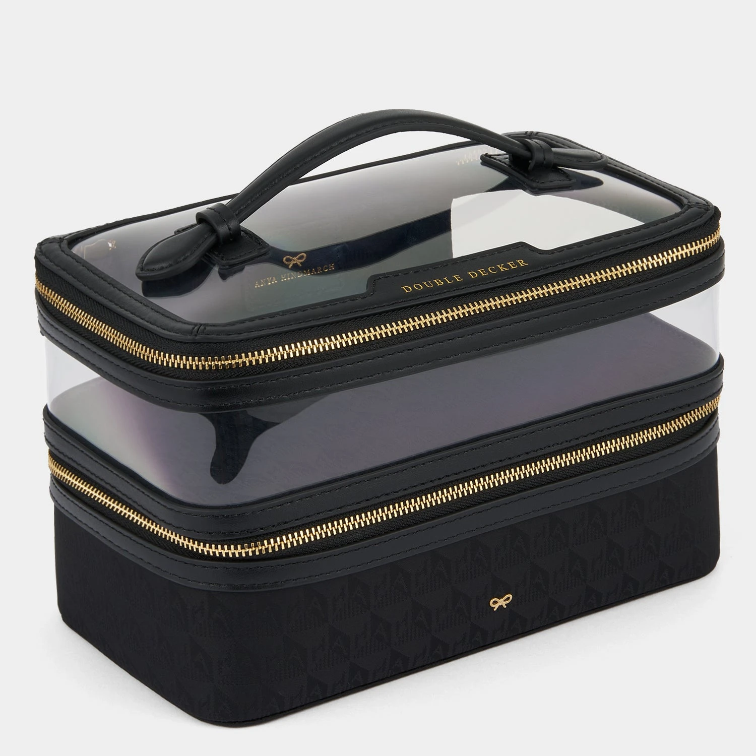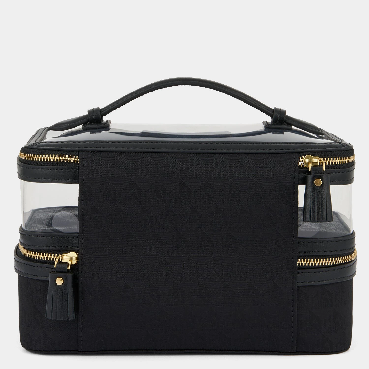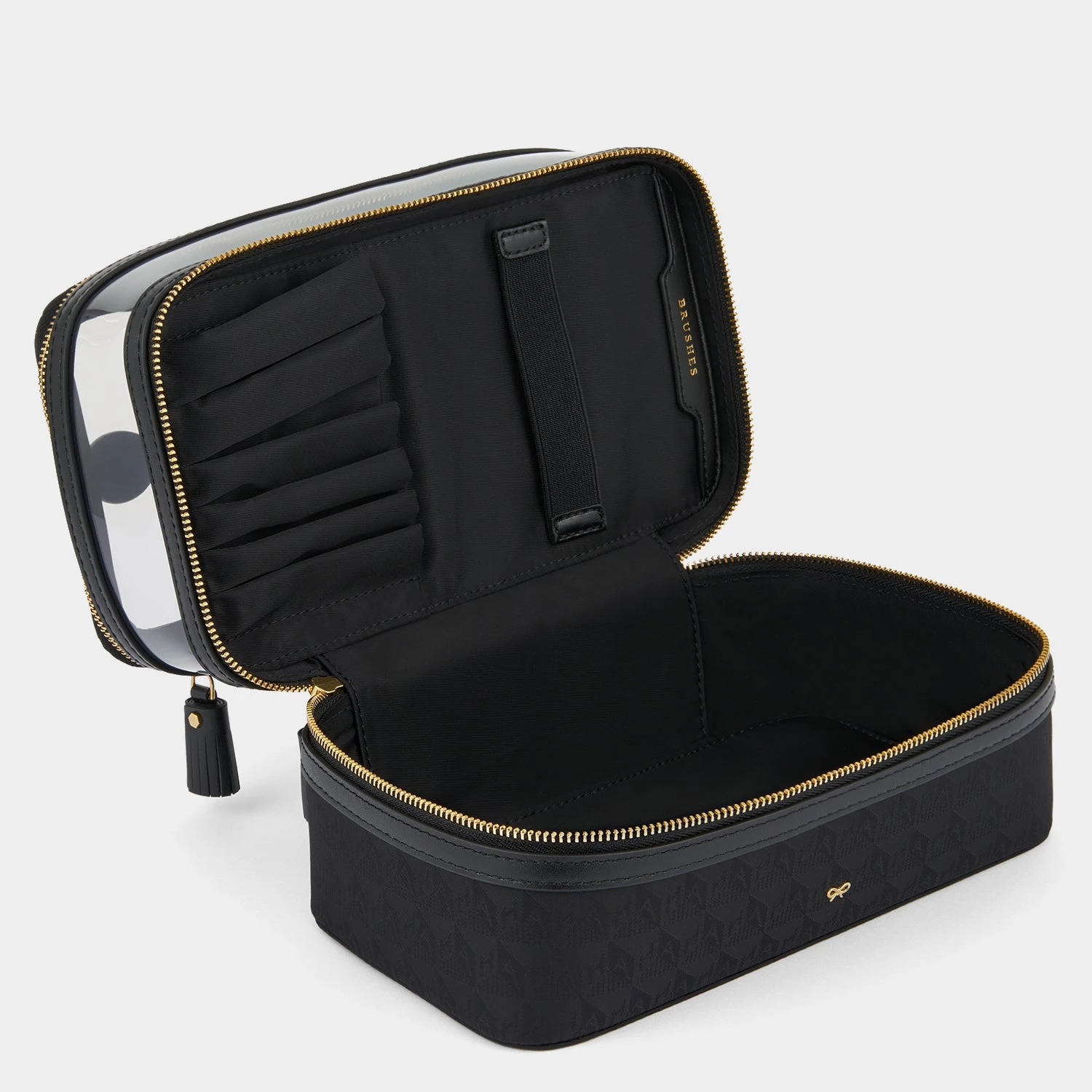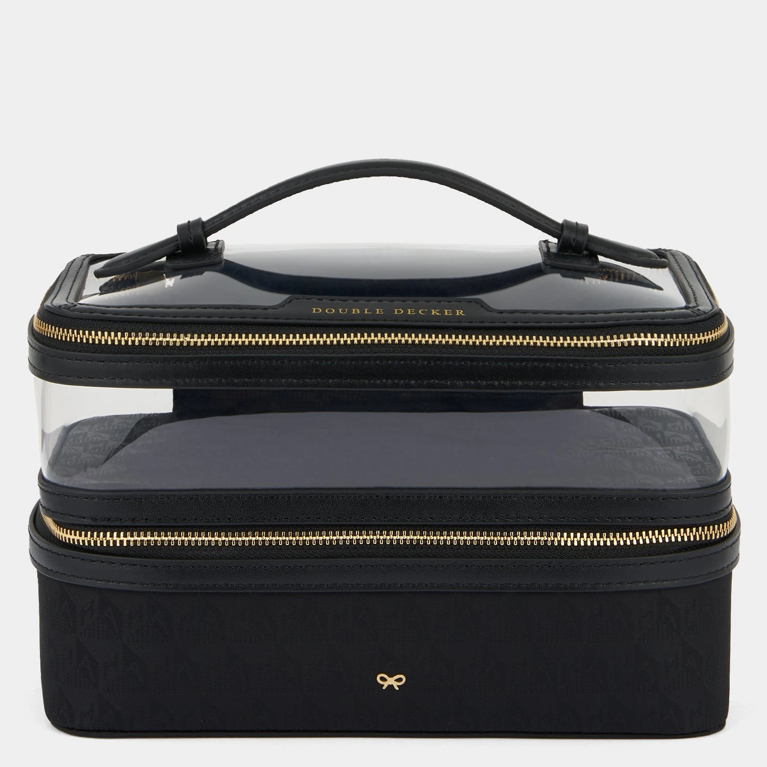 Sometimes, you don’t want to bring all of your favourite makeup and toiletries – we get that, which is why we created the Double Decker. It has two generously sized compartments – one in durable, monogrammed nylon, the other with a clear pane so you can easily locate your favourite products – with more than enough space for brushes and larger pots. All labelled, of course, and finished with a top handle, tasselled zips and our golden bow.