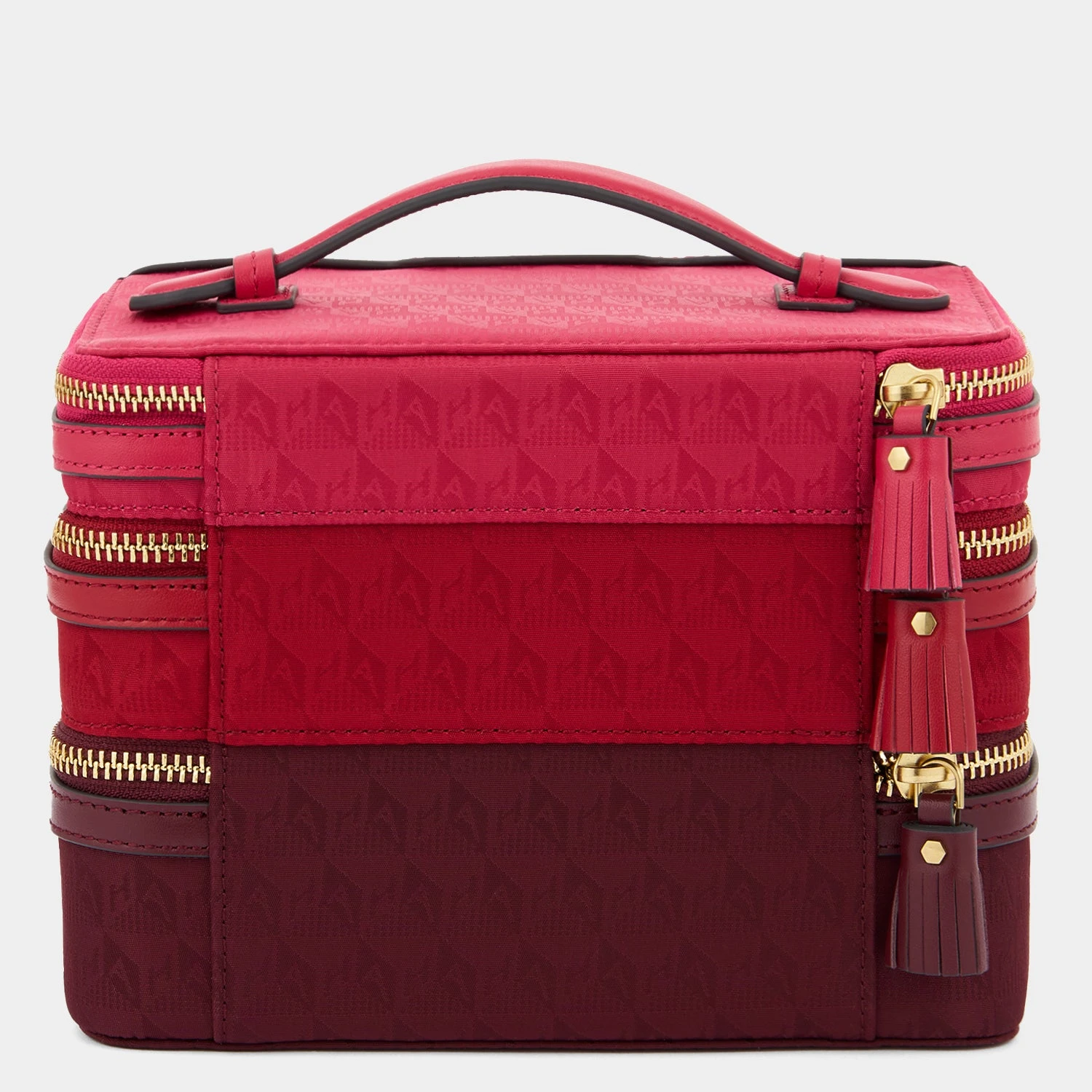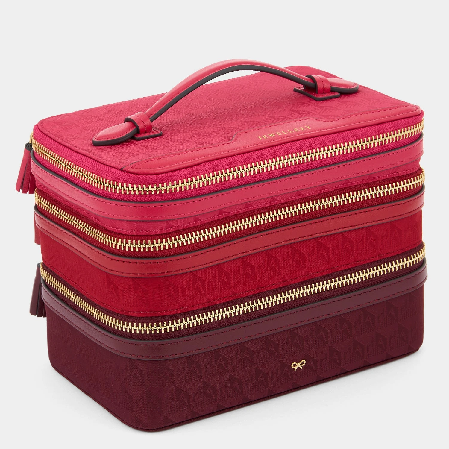 Keep your most precious treasures safely stowed while travelling with our Jewellery Stack. Its trio of zipped compartments, arranged to create a gradient effect, are designed to keep everything perfectly organised; keep earrings and rings in the top tier, necklaces, bracelets and brooches in the middle, and other rings and things in the base. All in our hardy (and beautiful) monogrammed nylon, with a top handle for easy carrying.