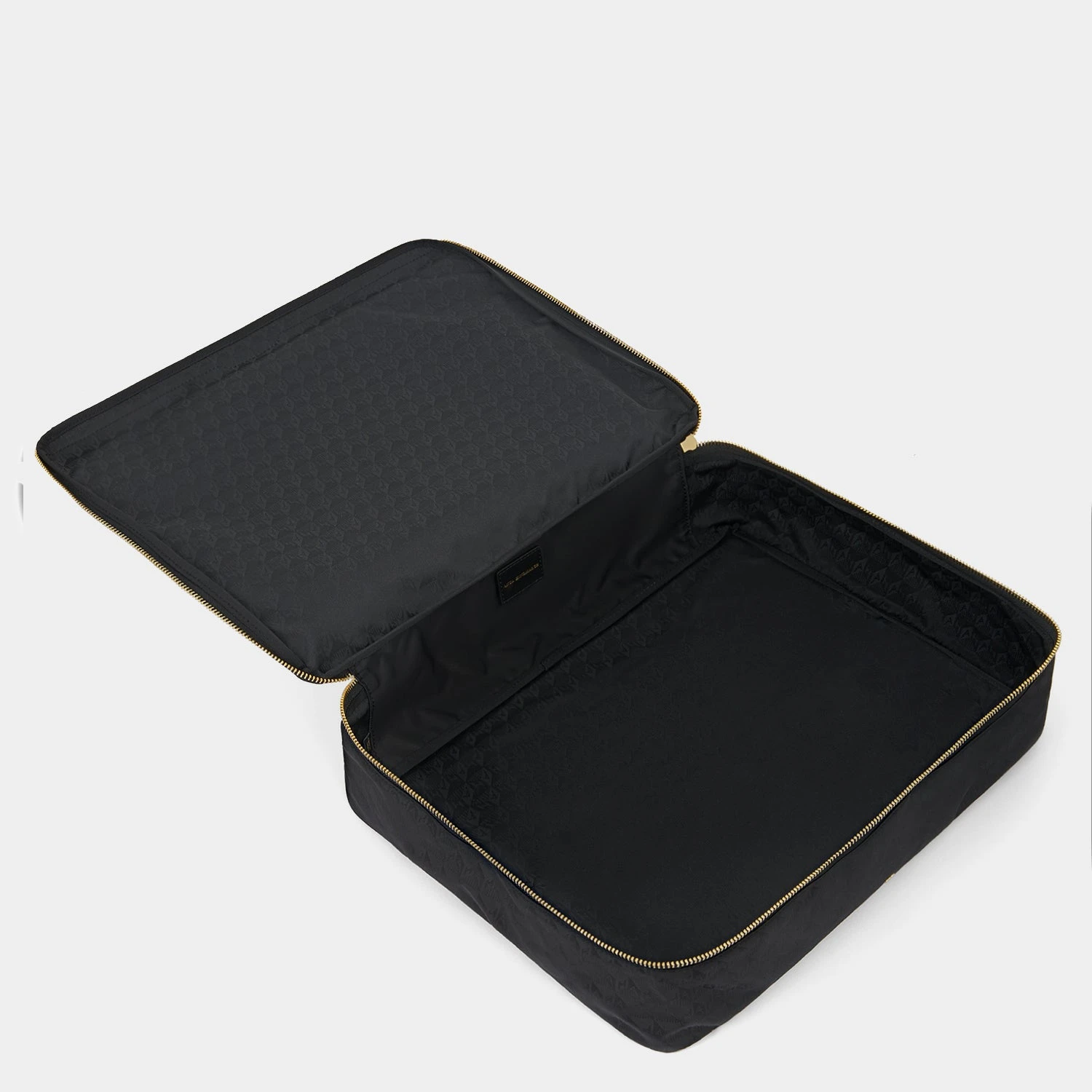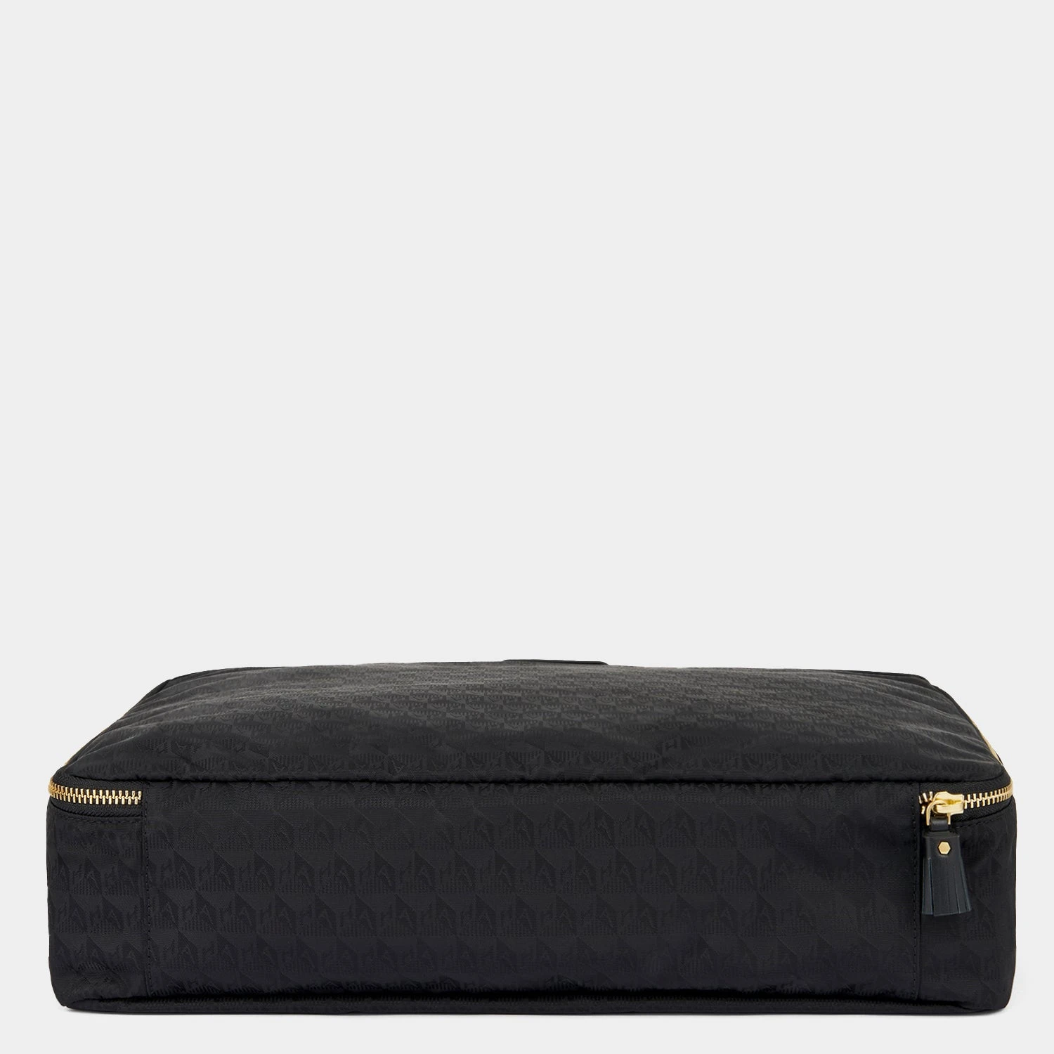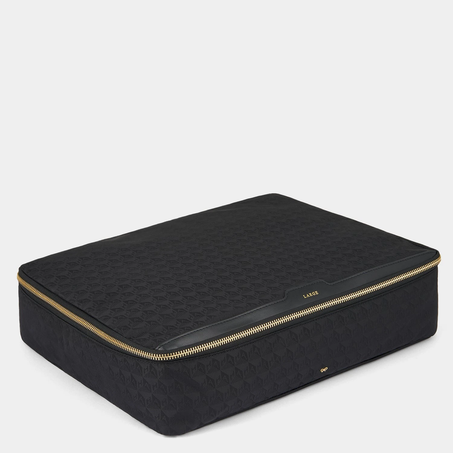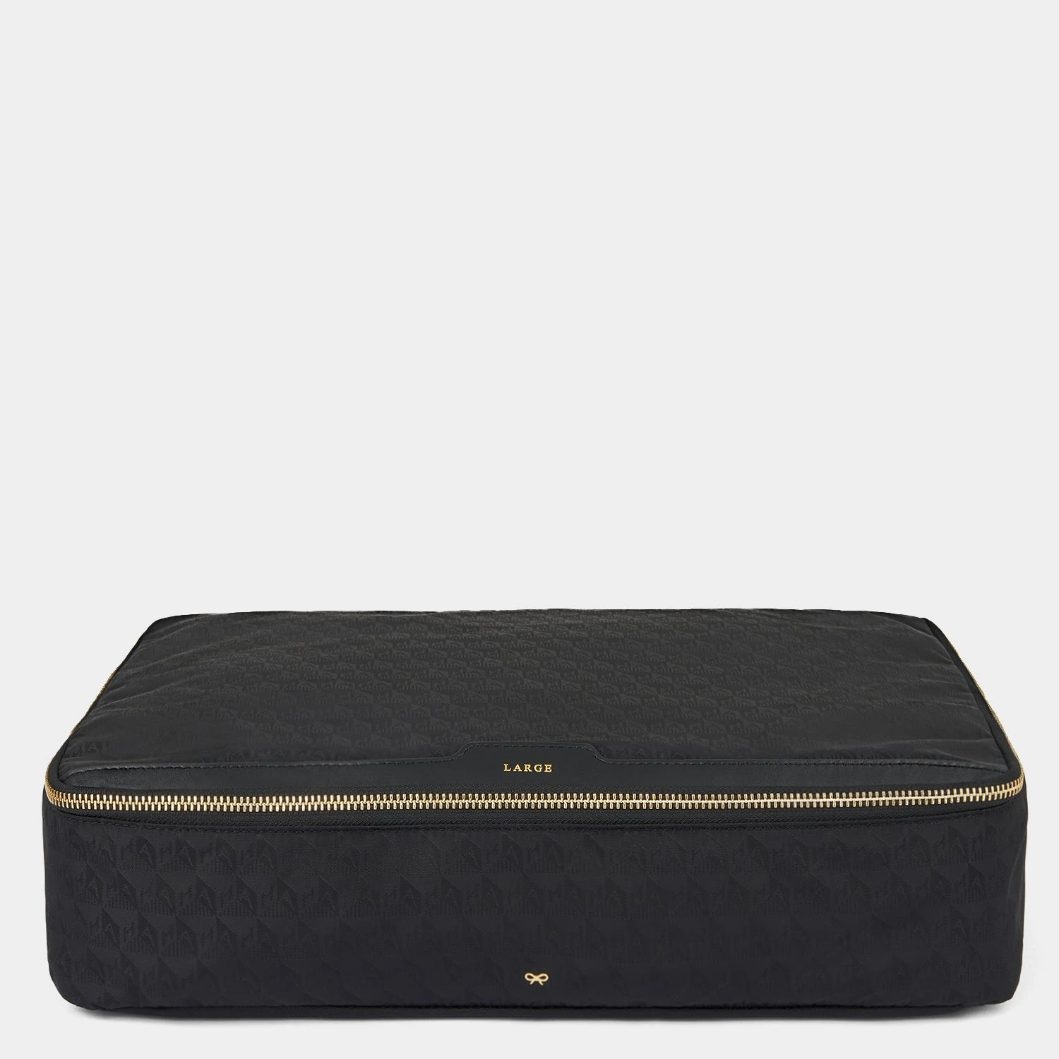 Packing and unpacking is a joy with the help of our Large Packing Cube. It’s crafted from logo-print, recycled nylon (unlined, so as not to weigh your suitcase down) and trimmed with leather. Concealed structure at the zip means it doesn’t lose its shape en route, but it can be easily collapsed when you reach your destination.