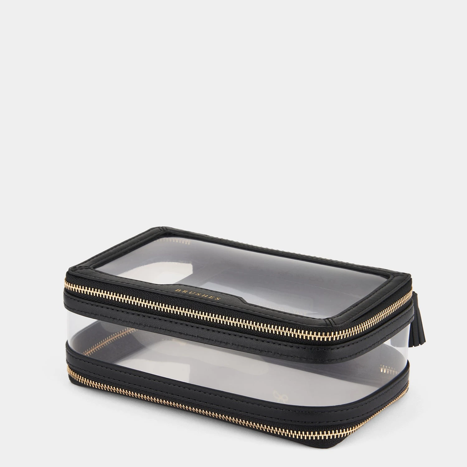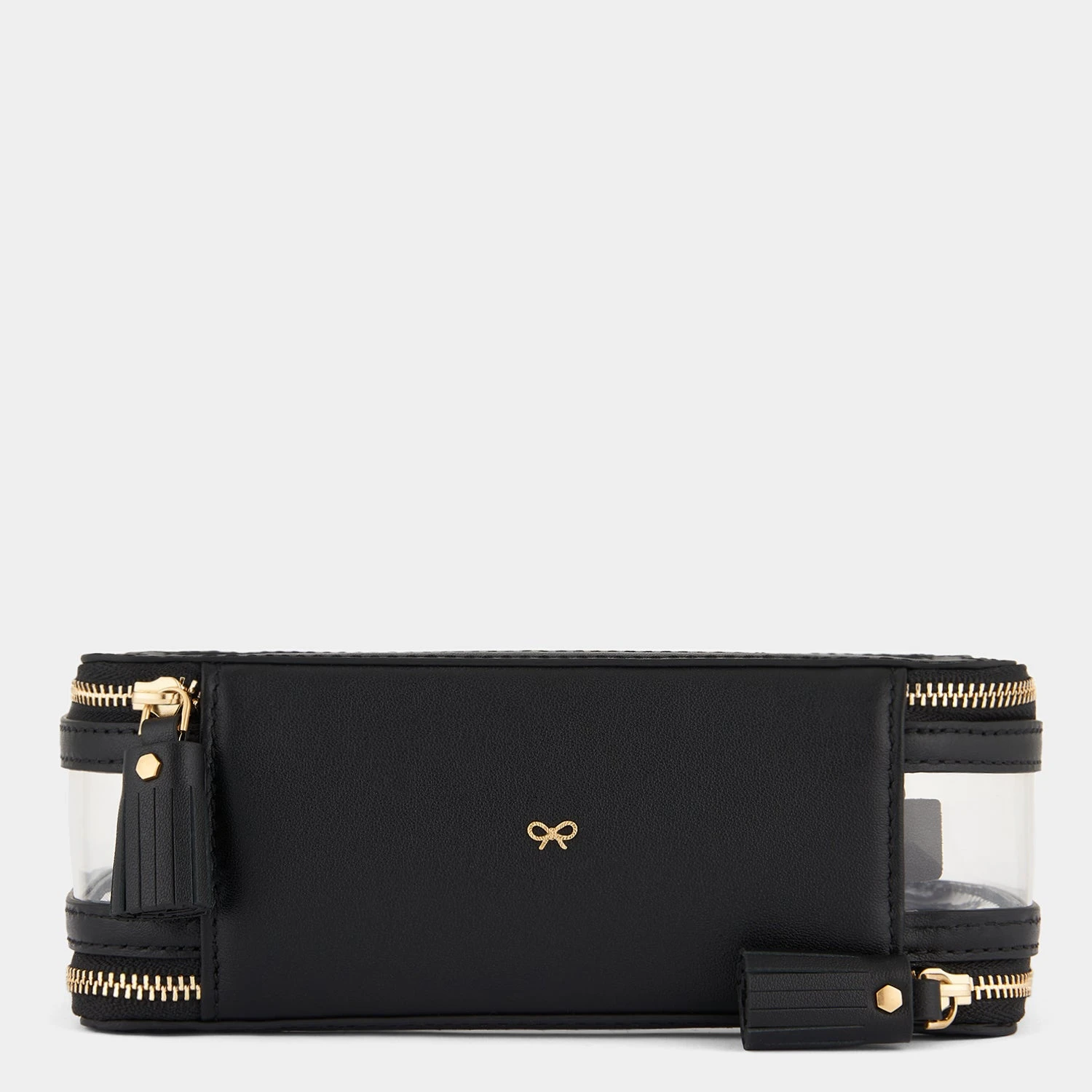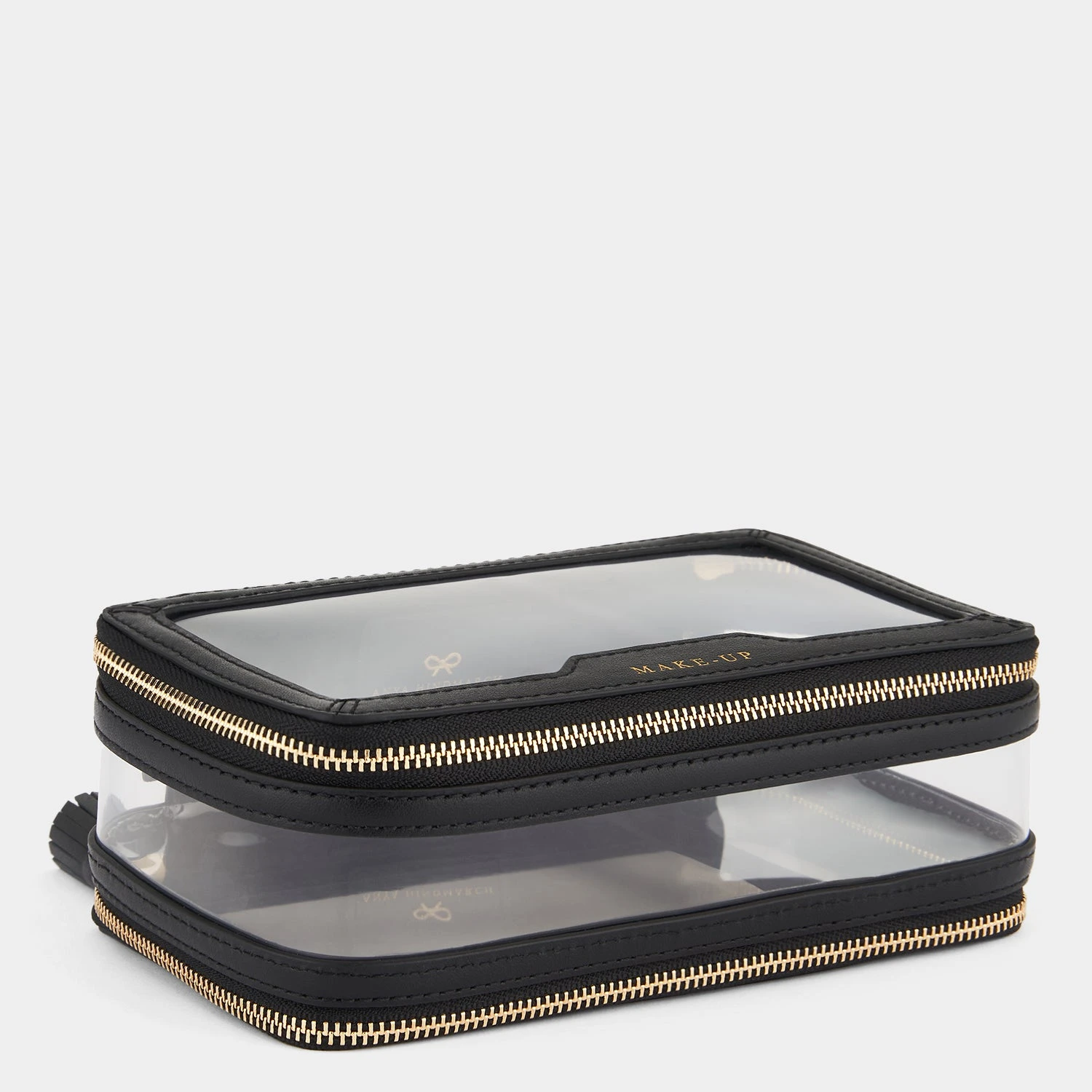 This clear Make-Up Case is the perfect on-the-go accessory. With a clear exterior to help you instantly find what you’re looking for, the case has two zipped compartments; one for all those make-up essentials and one for your favourite brushes to help you achieve that flawless make-up look with ease. Beautifully finished with patent trim, signature tassel zip fastenings and Anya Hindmarch bow.