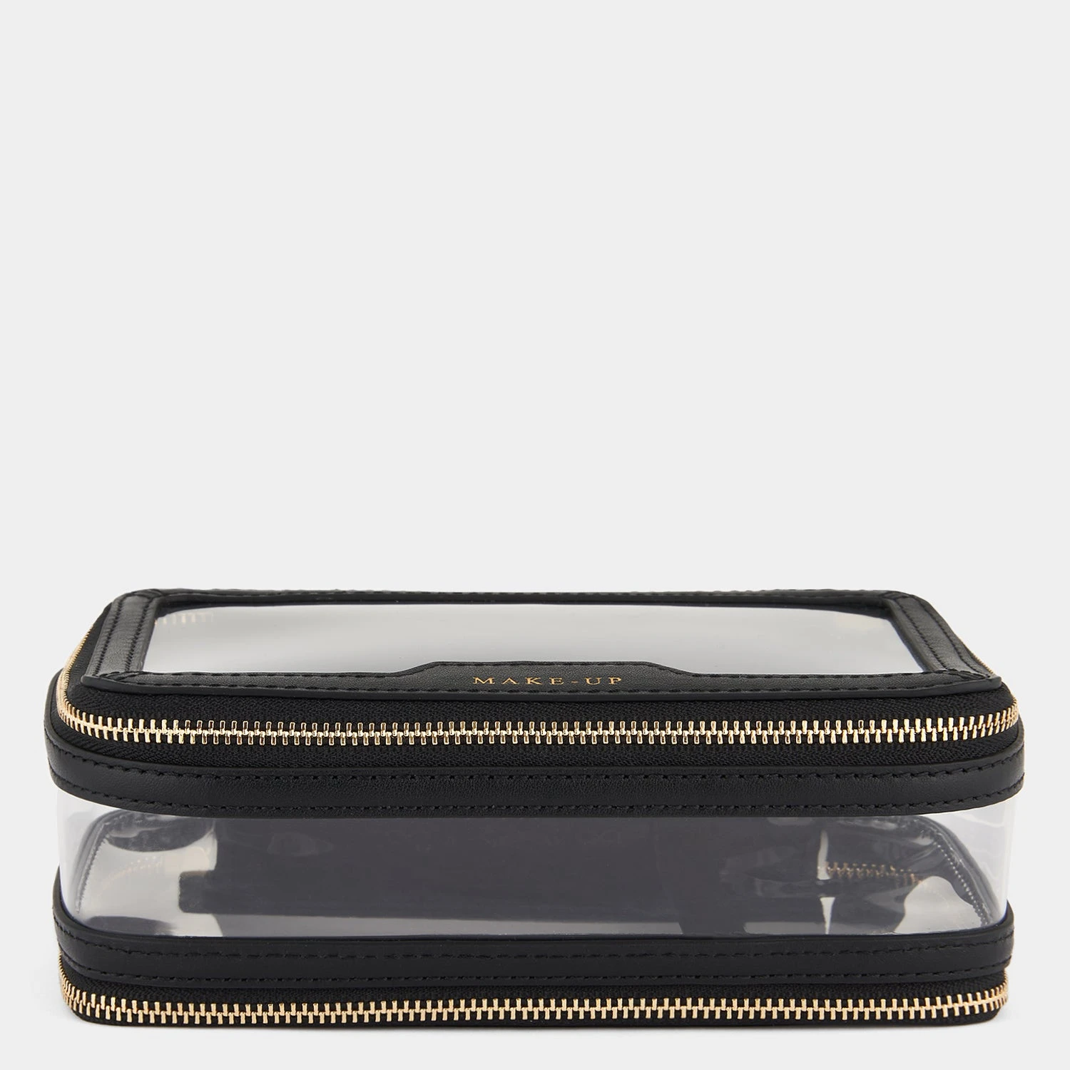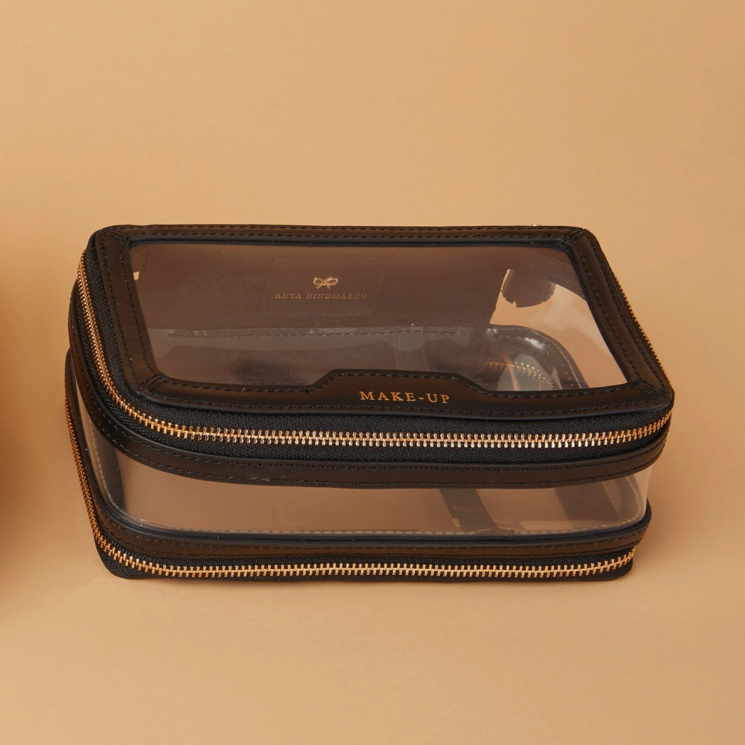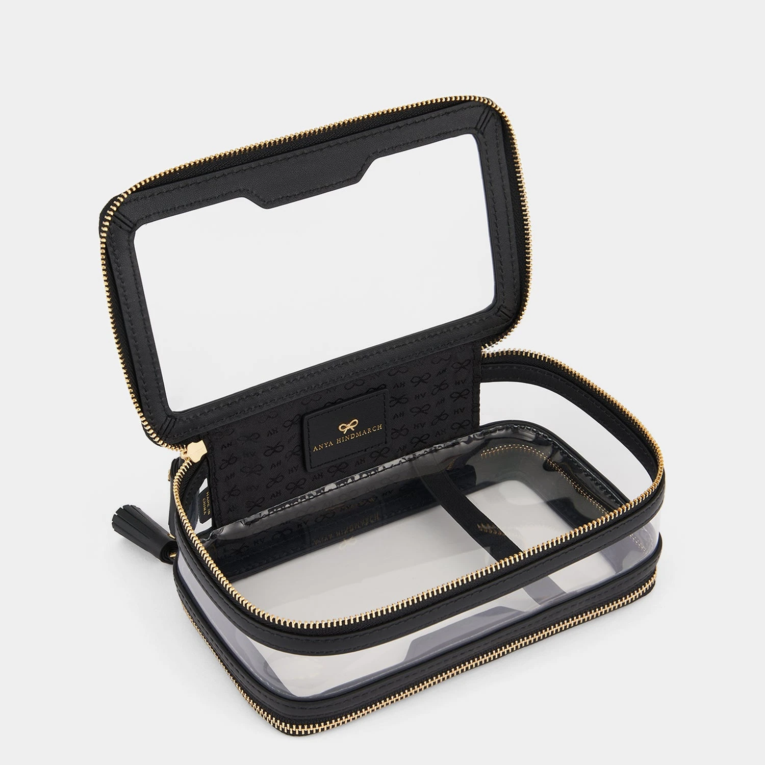 This clear Make-Up Case is the perfect on-the-go accessory. With a clear exterior to help you instantly find what you’re looking for, the case has two zipped compartments; one for all those make-up essentials and one for your favourite brushes to help you achieve that flawless make-up look with ease. Beautifully finished with patent trim, signature tassel zip fastenings and Anya Hindmarch bow.