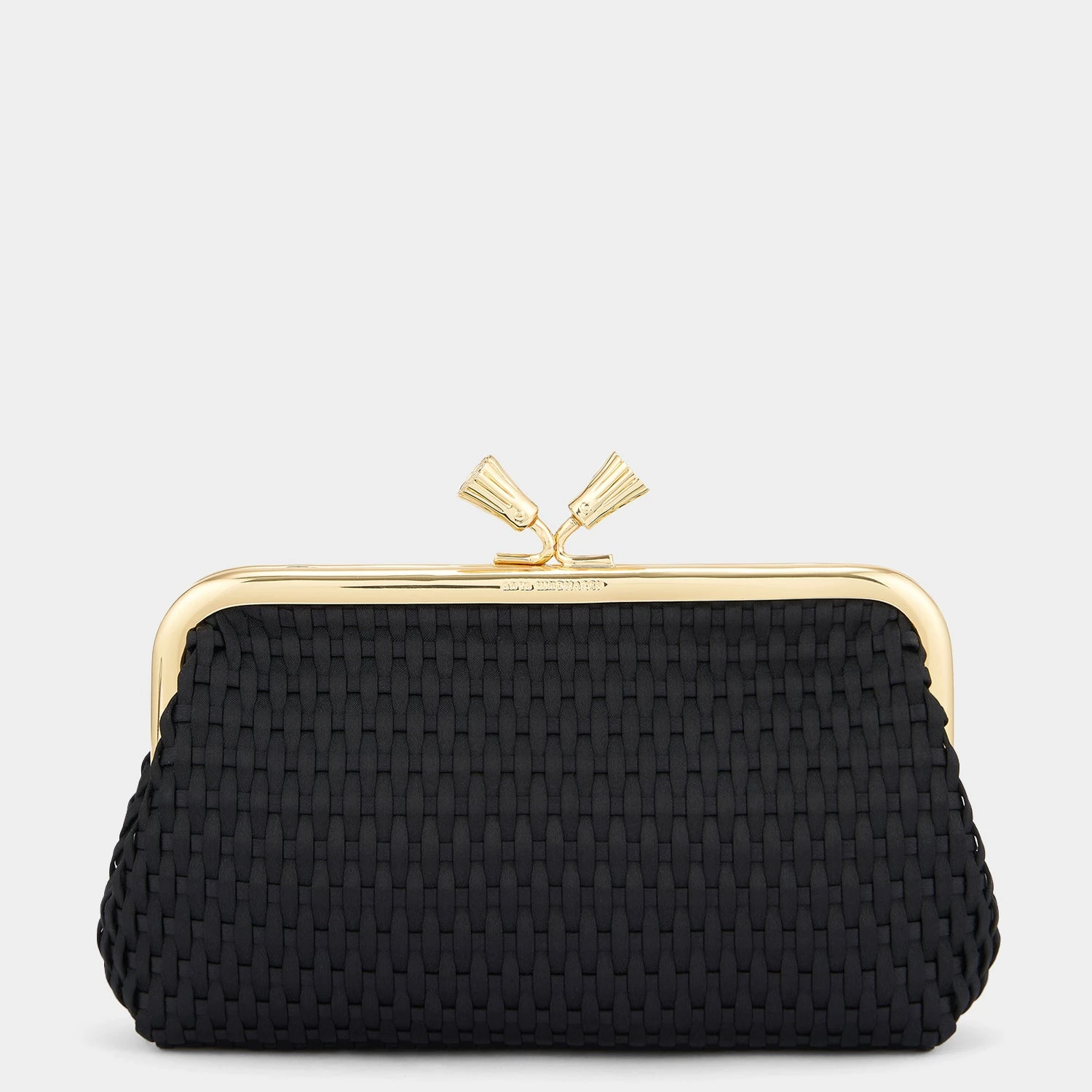 A staple silhouette within our accessories line-up, the Maud Clutch takes on a new persona with its latest incarnation, now interwoven from glossy satin to create a sumptuously textured finish. Complete with the style’s signature tassel-shaped clasps up top, its dinky profile boasts enough space to store your evening essentials inside – whether you’re taking it for a night on the town, or as a plus one for your next wedding invite.