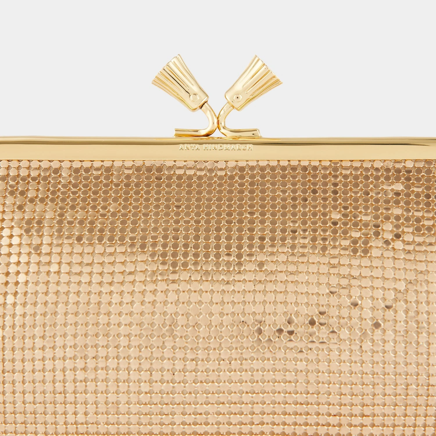 The kind of accessory that just can’t be kept indoors, the glittering silhouette of our Maud Clutch demands to be taken out on the town – whether it’s propping up the bar on a Friday night or heading to a summer wedding. Doused in shimmering metal sequins that effortlessly catch the light, the style’s staple silhouette is secured by a tassel-shaped clip fastening up top. Tuck it under your arm, or use its delicate chain strap to carry it over your shoulder.